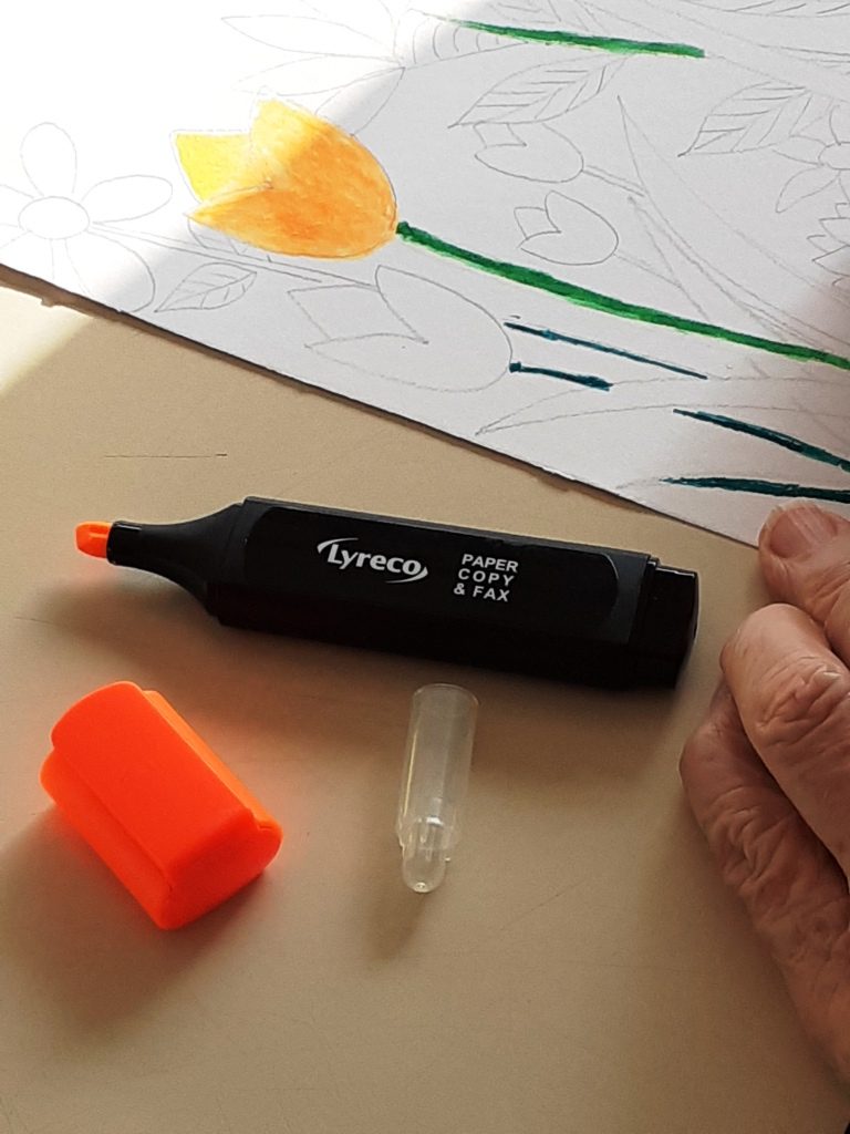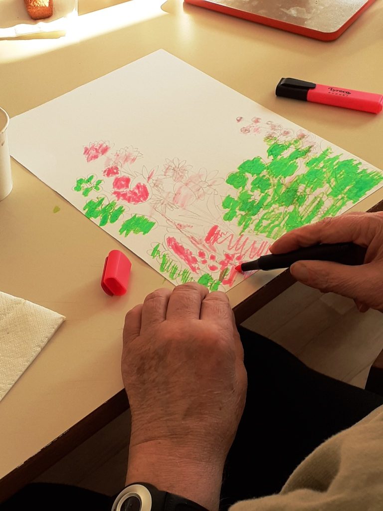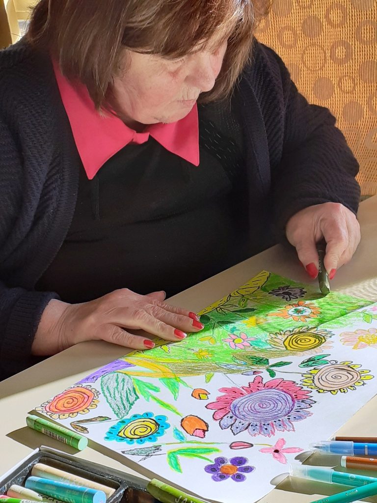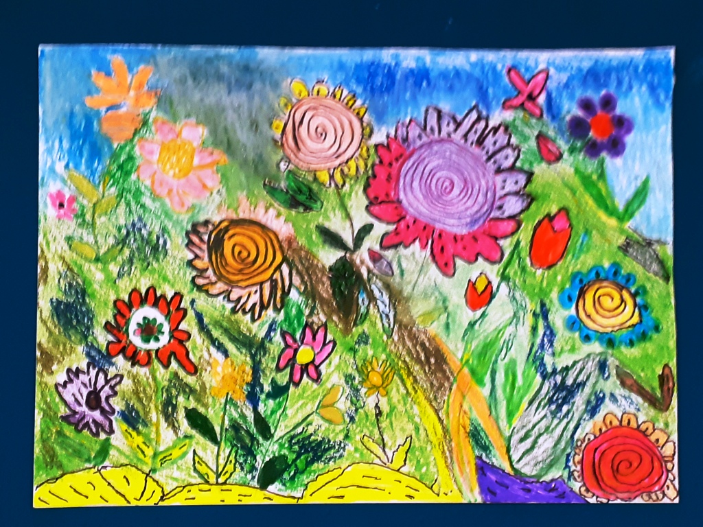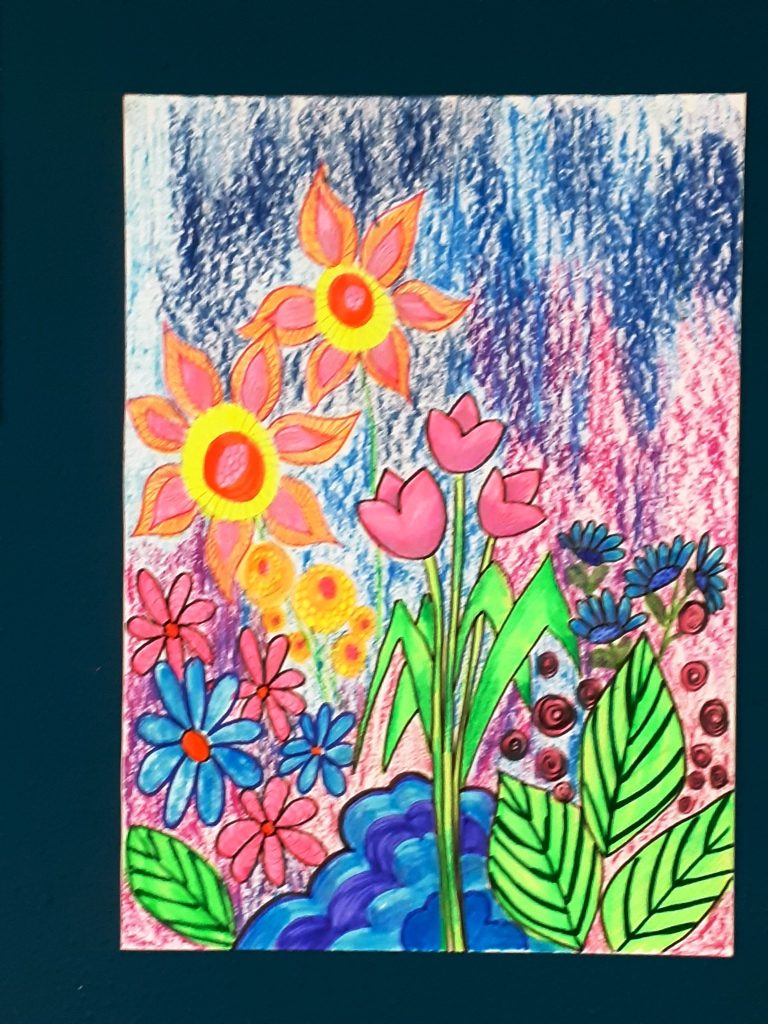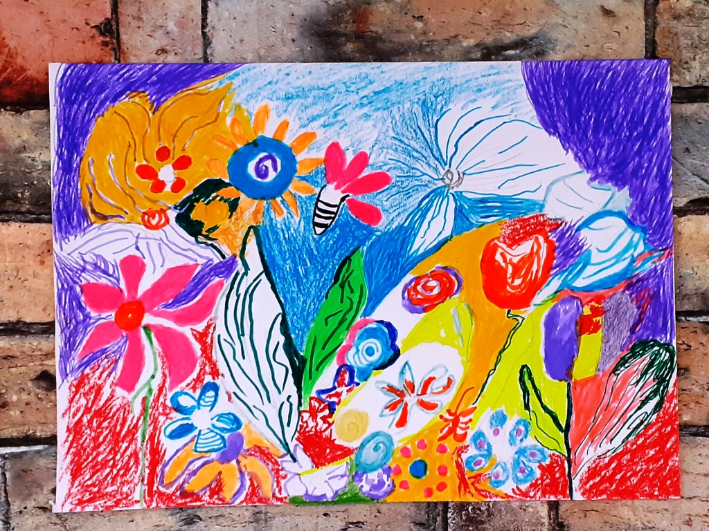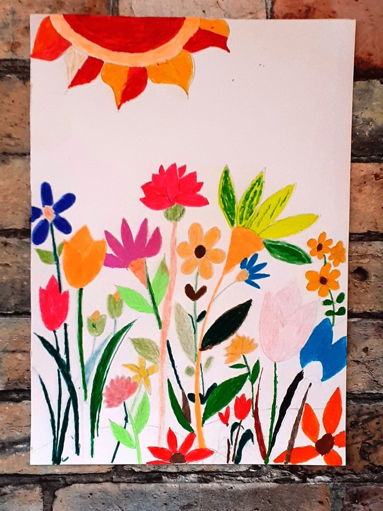 Avec crayons, feutres et pastels gras, nous avons imaginé un petit coin de notre jardin…